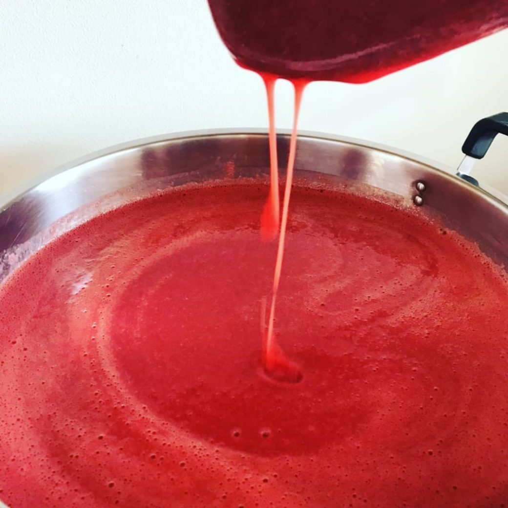 ひとつひとつ丁寧にヘタを取り、ミキサーにかけて、じっくり煮詰めていきます。
