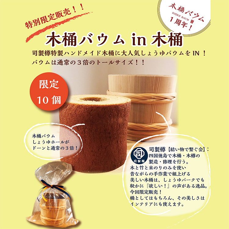まずは、木桶職人 司製樽のハンドメイドの特製木桶にはいった「木桶バウムin木桶」を限定販売!!