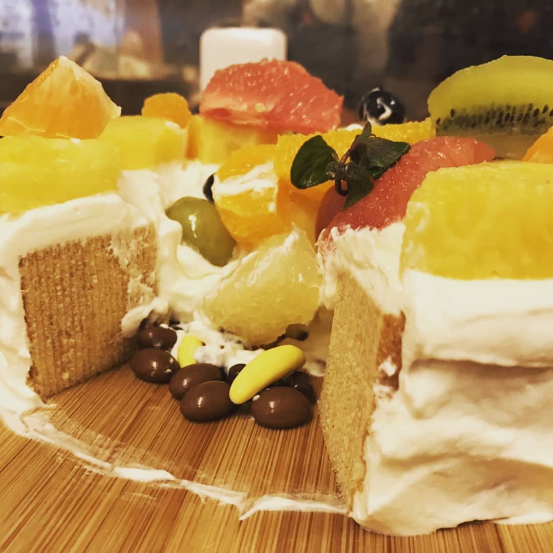 全体に生クリームを塗ったらフルーツを飾り付けて完成!