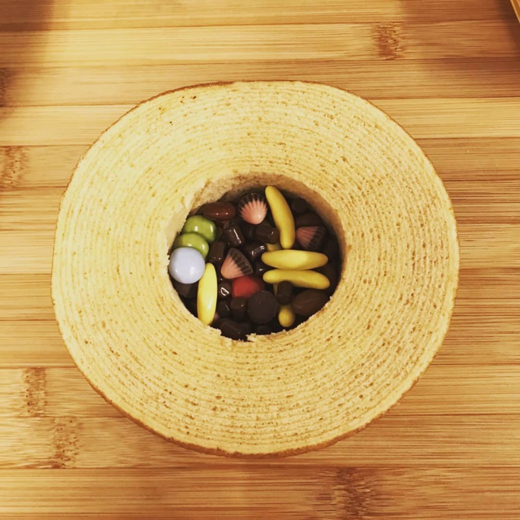 真ん中にはお好みのフルーツやアポロ、マーブルチョコなどを詰めて。