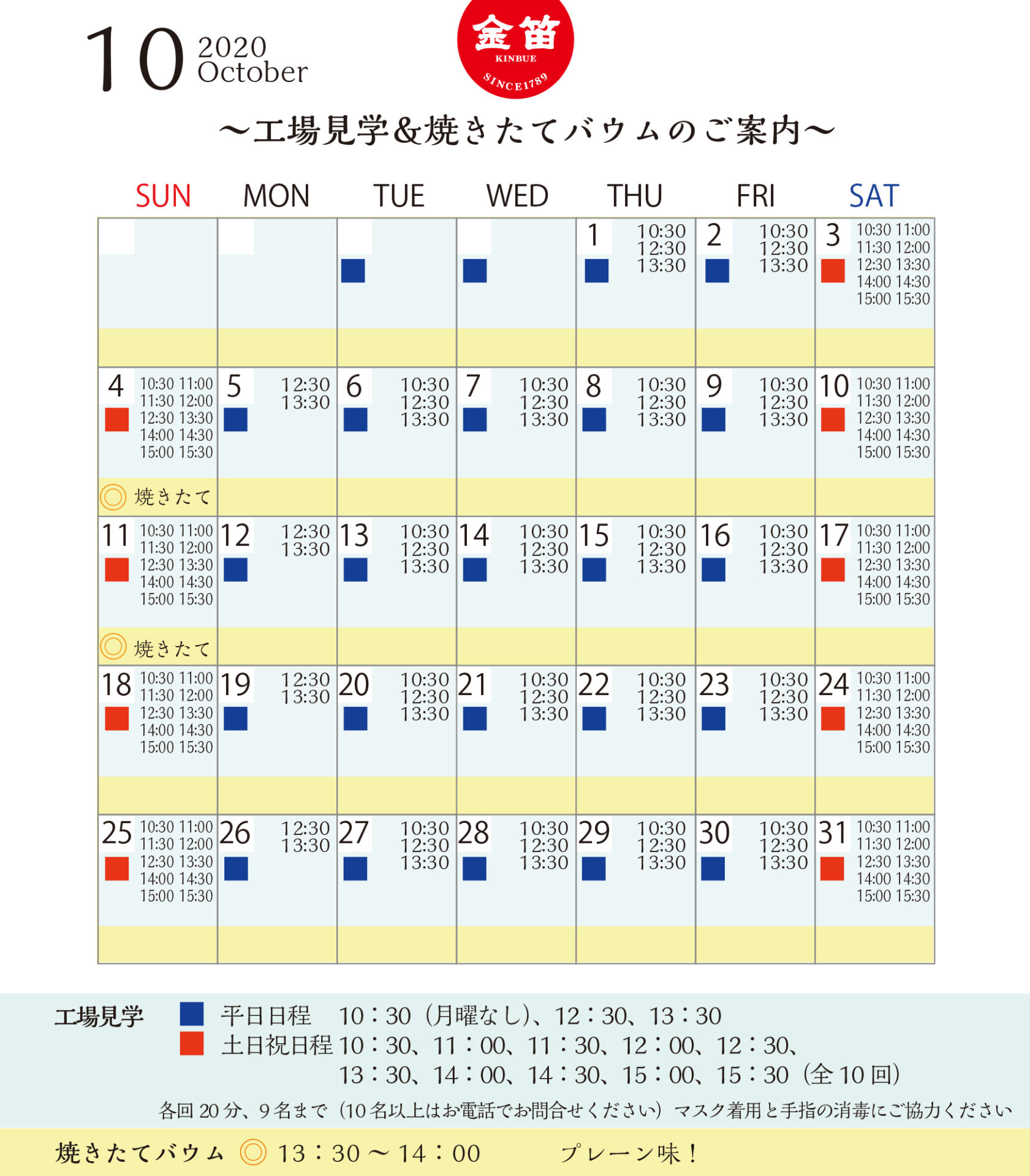 10月の金笛しょうゆパーク、工場見学(金笛しょうゆ楽校)&焼きたてバウムのスケジュールです!