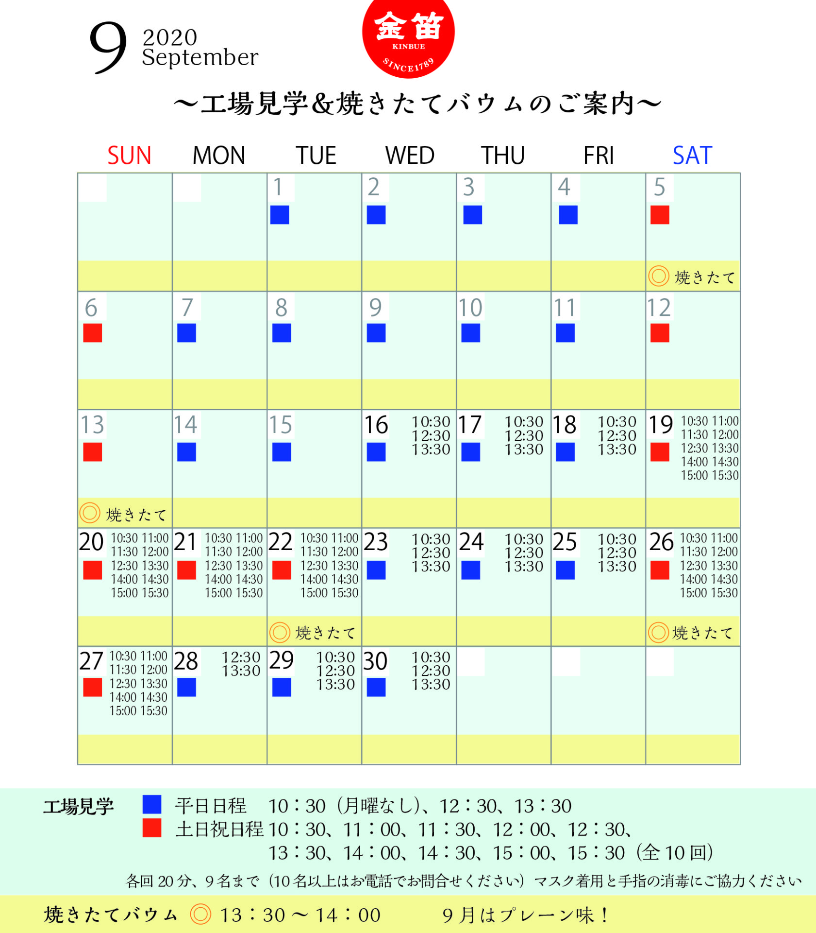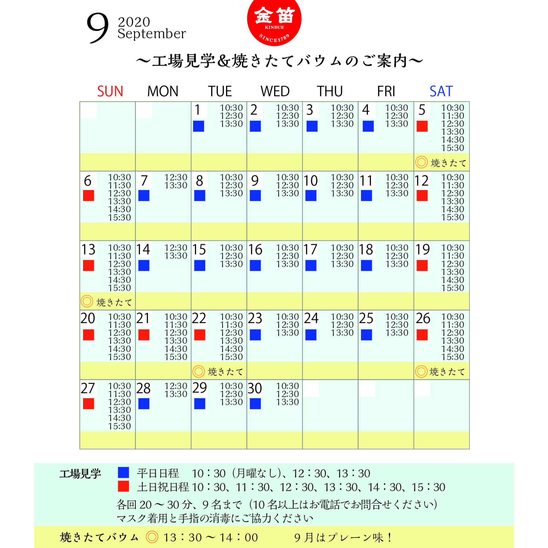 金笛しょうゆパーク9月の工場見学&焼きたてバウムの予定です。