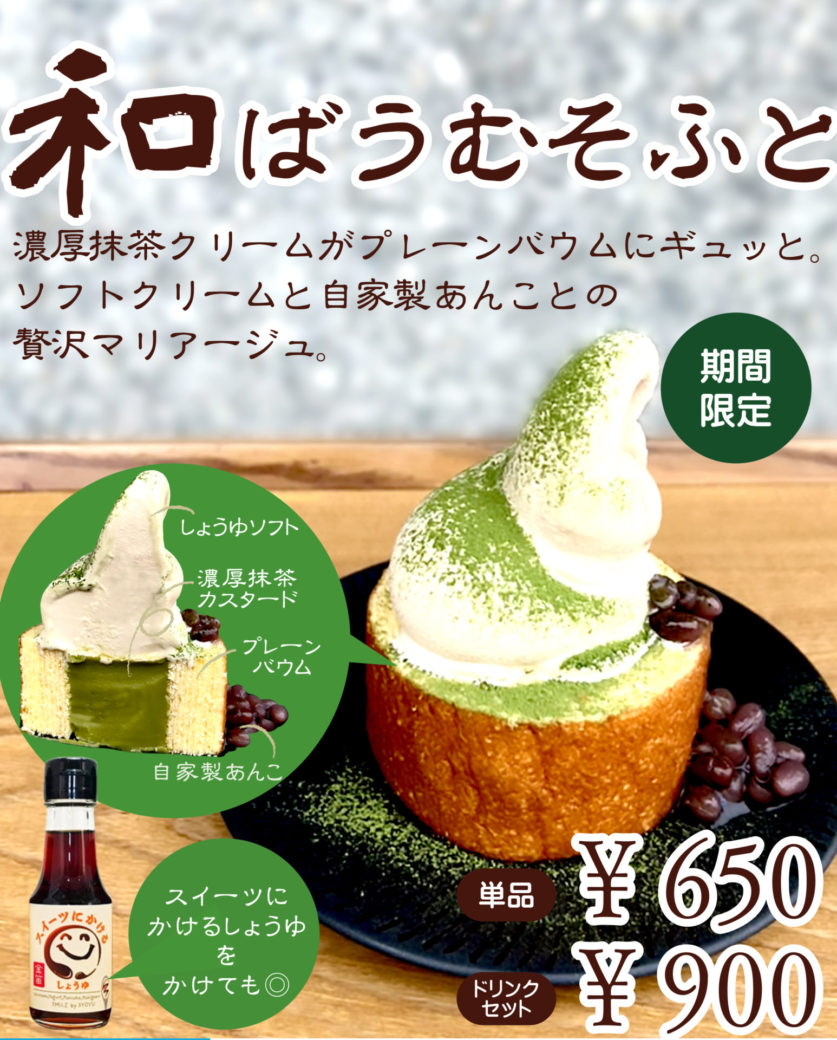 ほんのりとラム酒香るプレーンバウムに、濃厚抹茶カスタードをIN!しょうゆソフトと抹茶パウダー、さらに自家製あんこをトッピングした和スイーツです!