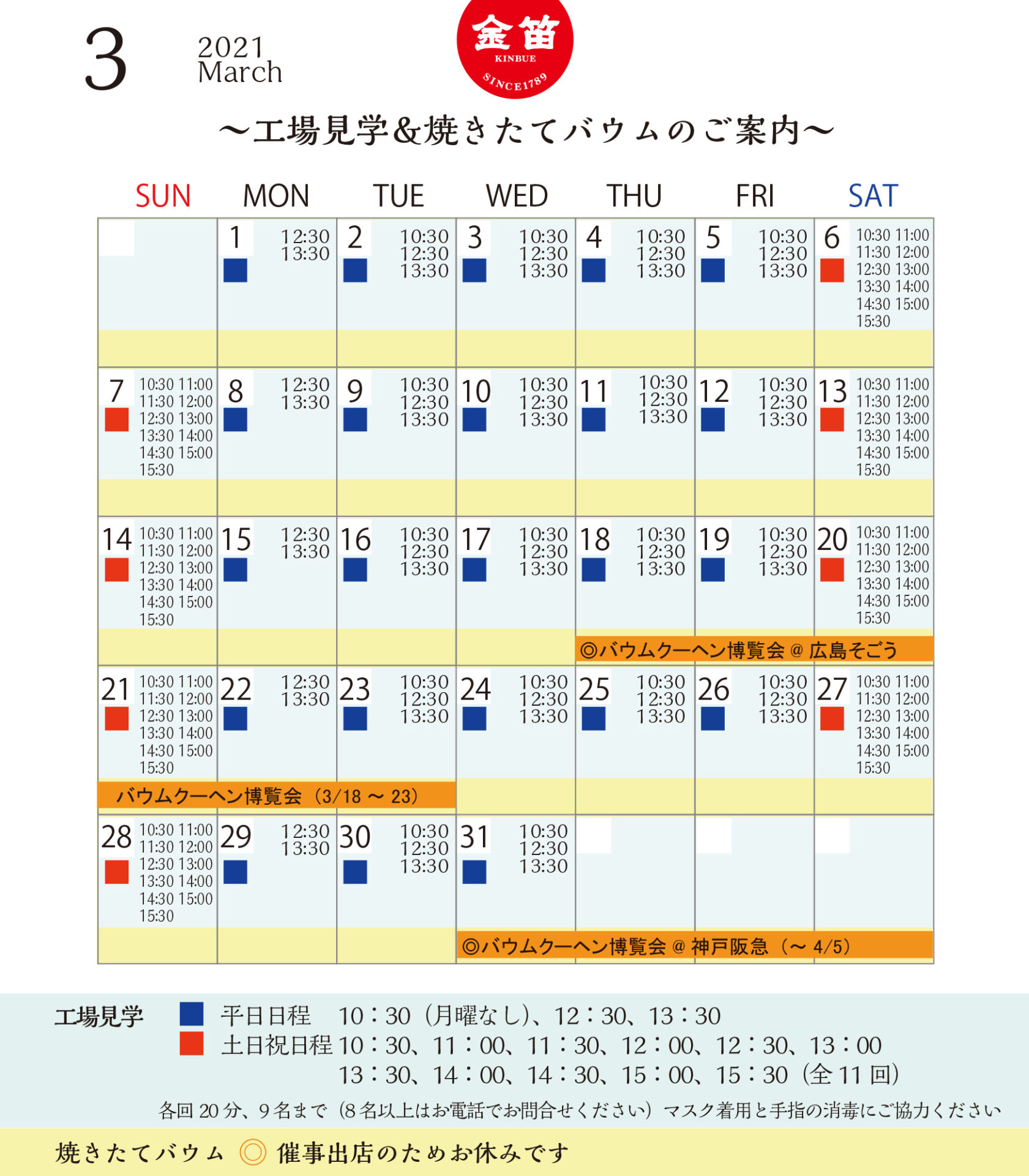 ・工場見学は平日3回、土日祝日11回で予定しています。