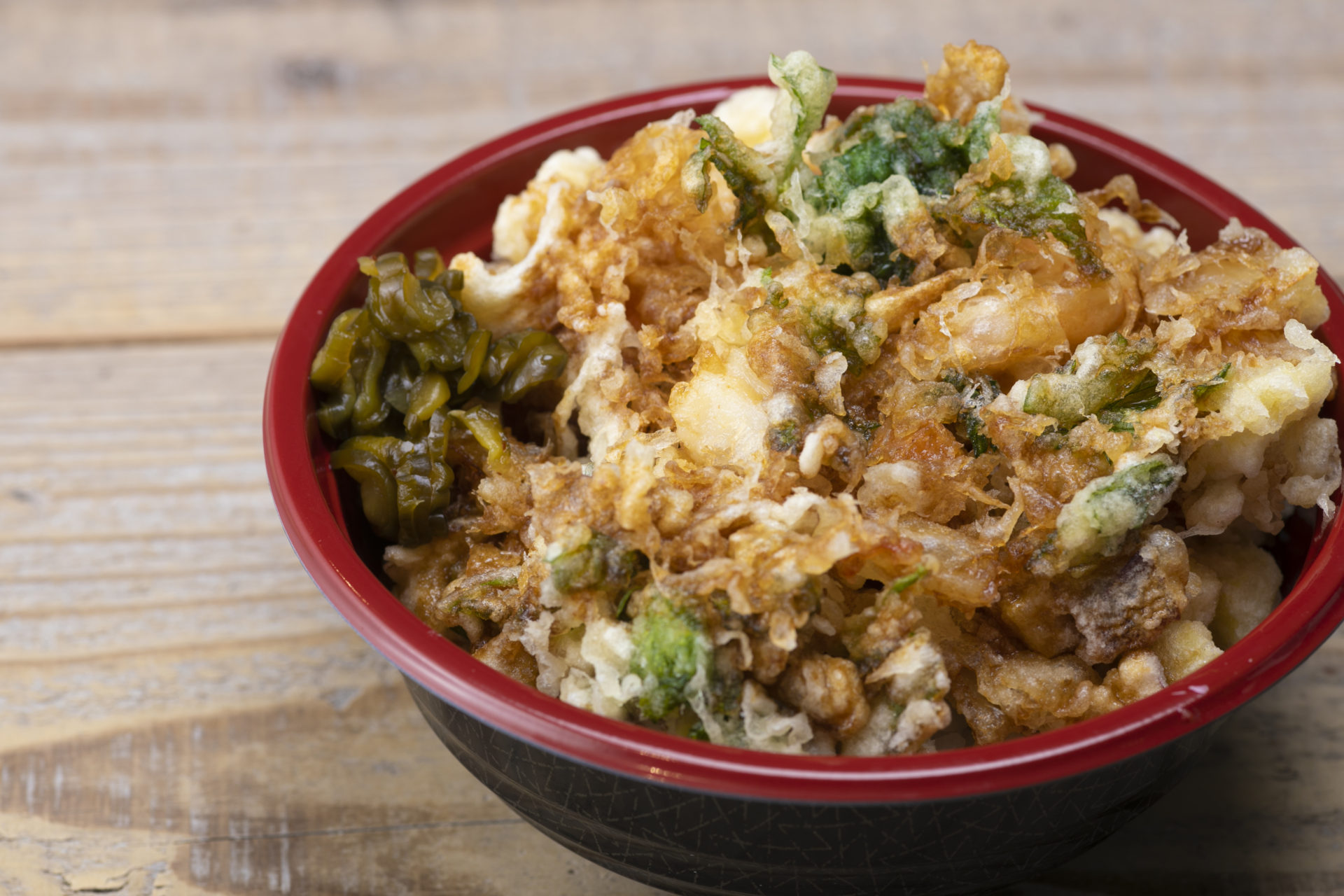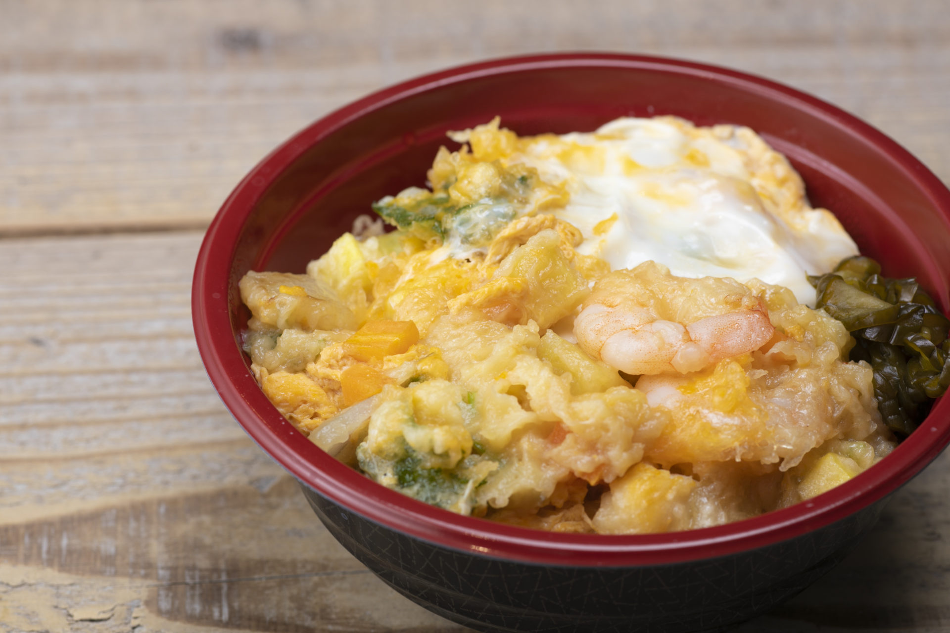 続いては、さくフワのかき揚げ丼、たっぷりの丼ダレがたまらないおいしさです。