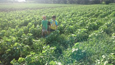 写真は川島町の自社の大豆畑で、三男の勘三郎と従兄弟がお手伝い。