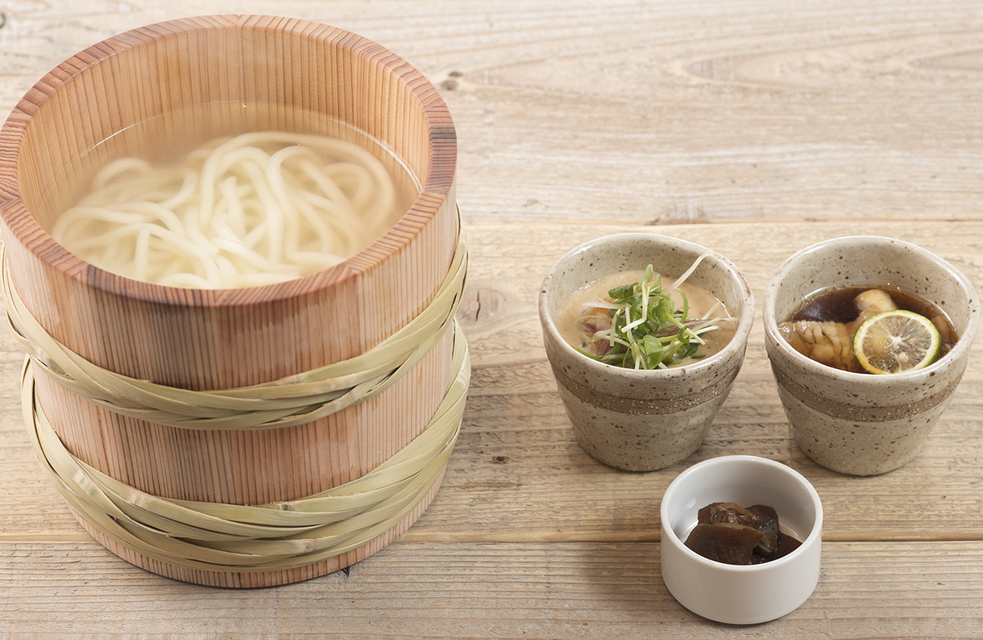 レストランでは、木桶職人さん一つ一つ手づくりの木桶に入ったアツアツのうどんで召し上がっていただけます。