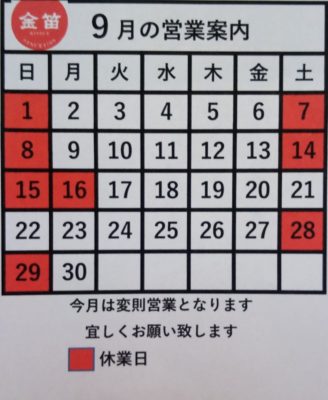 9月本店直売店の営業日のお知らせ