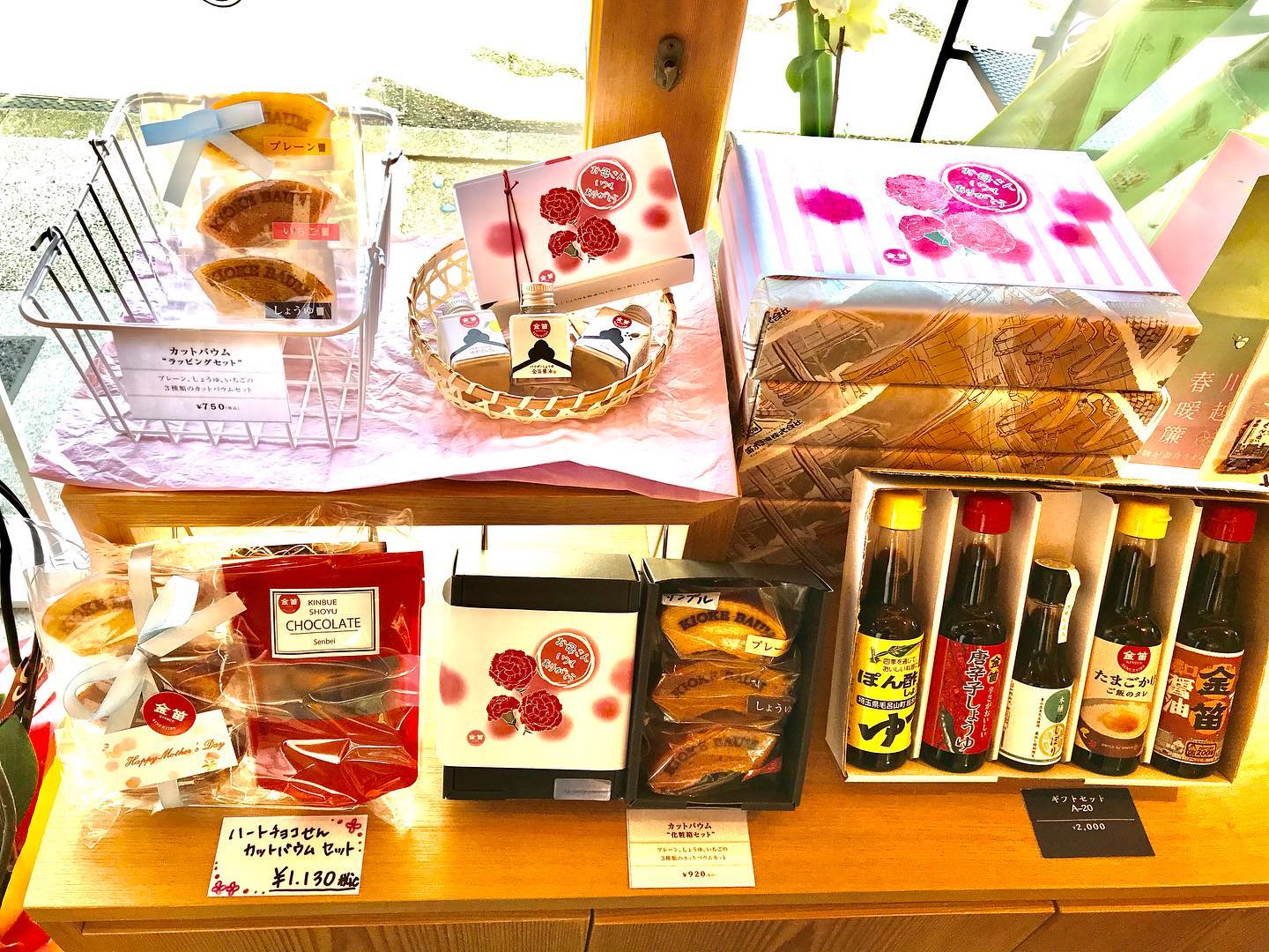 金笛では母の日のラッピングをご用意しております! ギフトセットのほか、バウムと醤油やパウダーなどの詰め合わせも対応いたします。 スタッフまでお気軽にご相談ください!