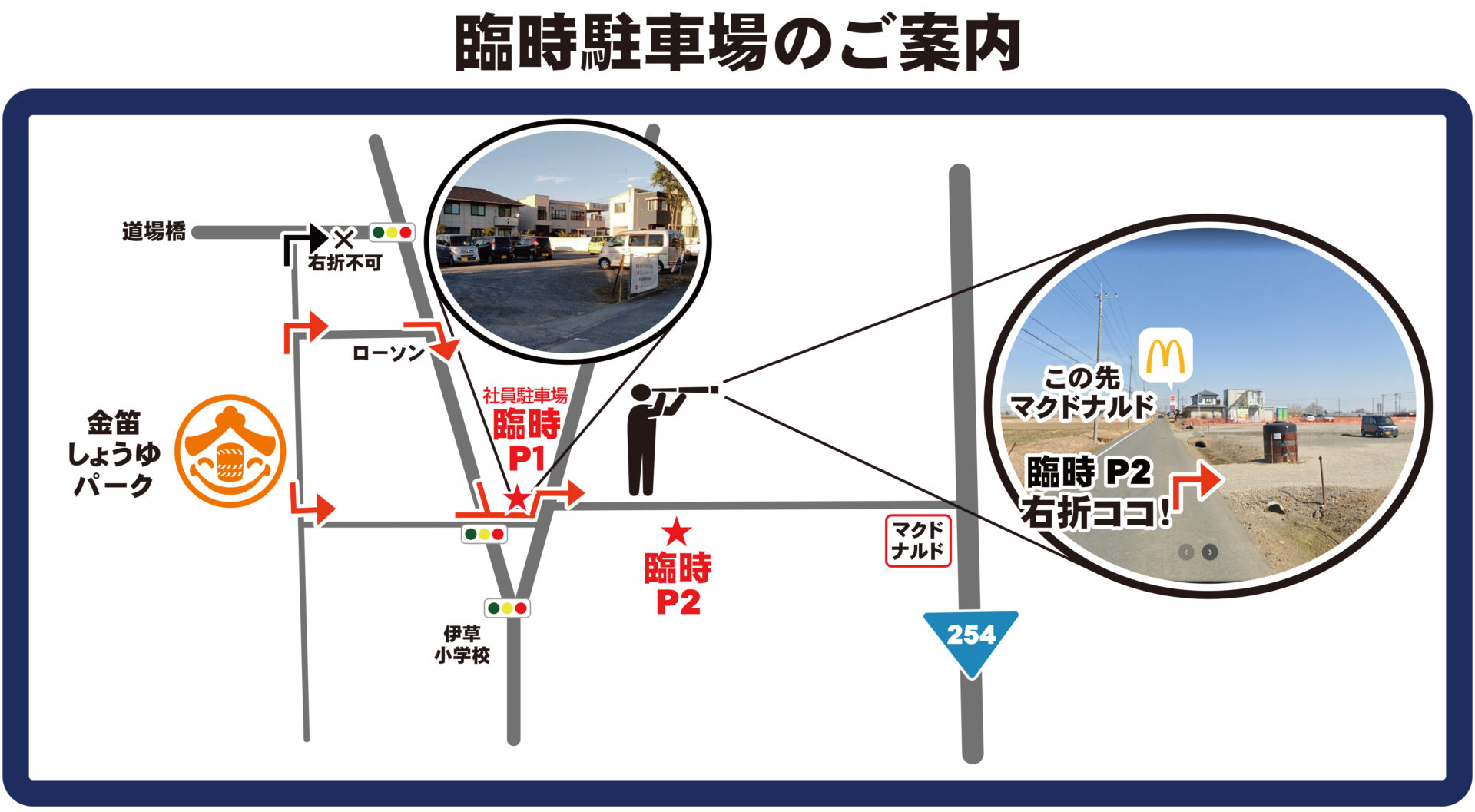 カーナビでは「マクドナルド川島店 TEL 049-299-2072」と入力すると 途中に臨時駐車場1、2がございます。