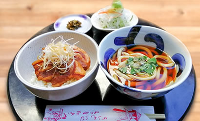 金笛自慢のとろとろの角煮を贅沢に乗せたどんぶりに、うどんとサラダがついた大満足のセットです!