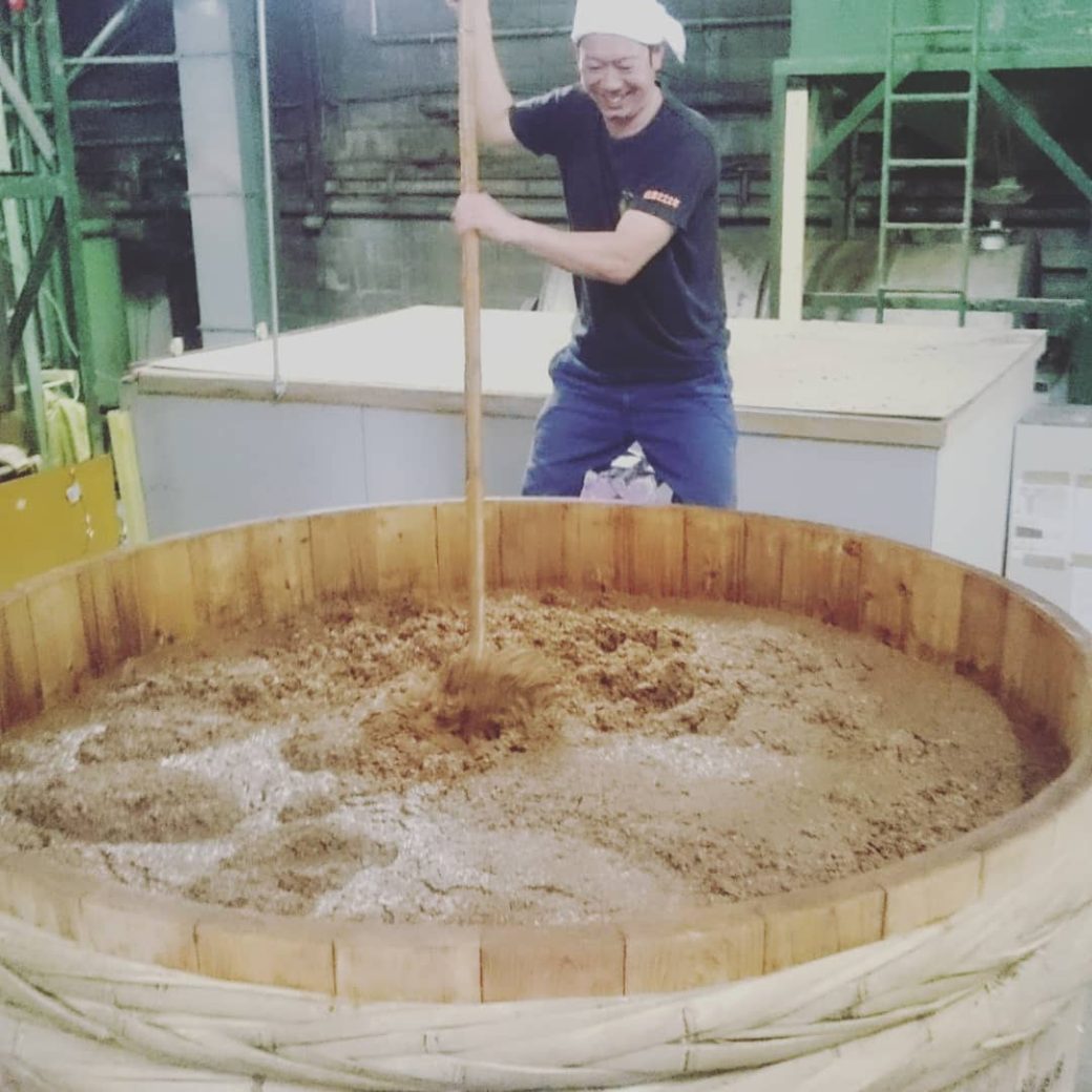 ※写真は一昨年、埼玉県産の木材で制作した木桶のもろみを櫂突きする当主吉五郎。醤油と一体化する笑顔。