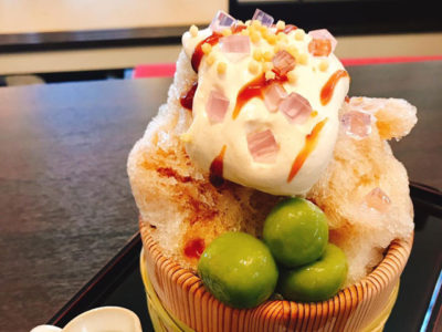 冷たい氷に自家製あずき、ぷるぷるの白玉、きなこ、そしてスイーツにかけるしょうゆをたっぷり!!