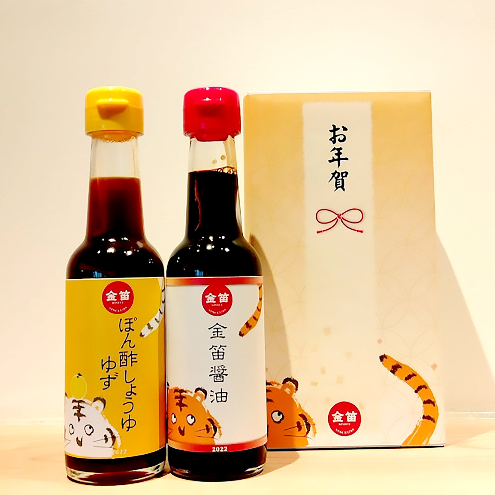 今年は金笛醤油(150㎖)、ぽん酢しょうゆ ゆず(150㎖)と、
