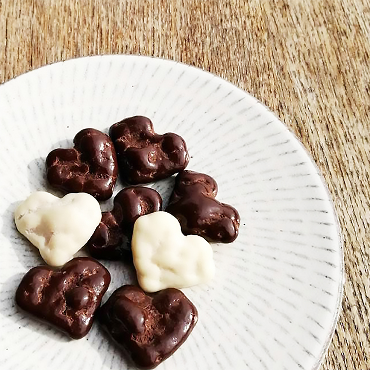 ハート型のおせんべいにミルクチョコレートとホワイトチョコレートがたっぷりかかった