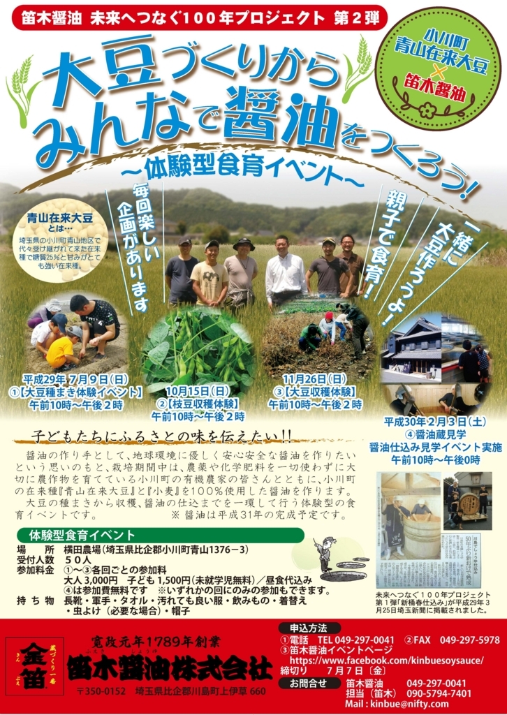 「安心安全な醤油・ふるさとの味を100年先に伝えたい」、そんな笛木醤油の想いに共感いただいた小川町の有機農家さんたちと、大豆の種まきから収穫、醤油の仕込みまでを体験できるイベントを開催することになりました。