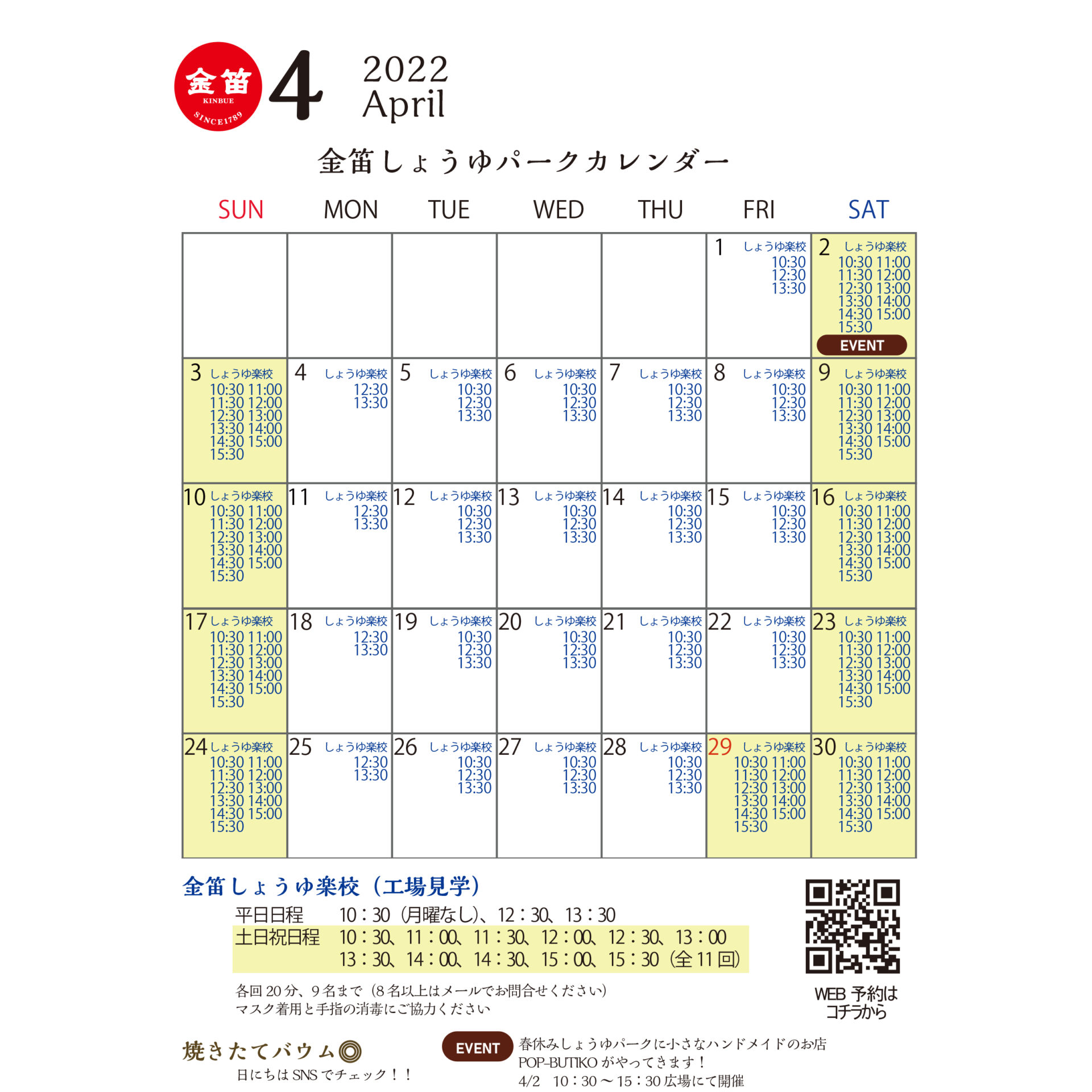 さて4月の金笛しょうゆパーク、毎日元気にしょうゆ楽校(工場見学)を開催します。