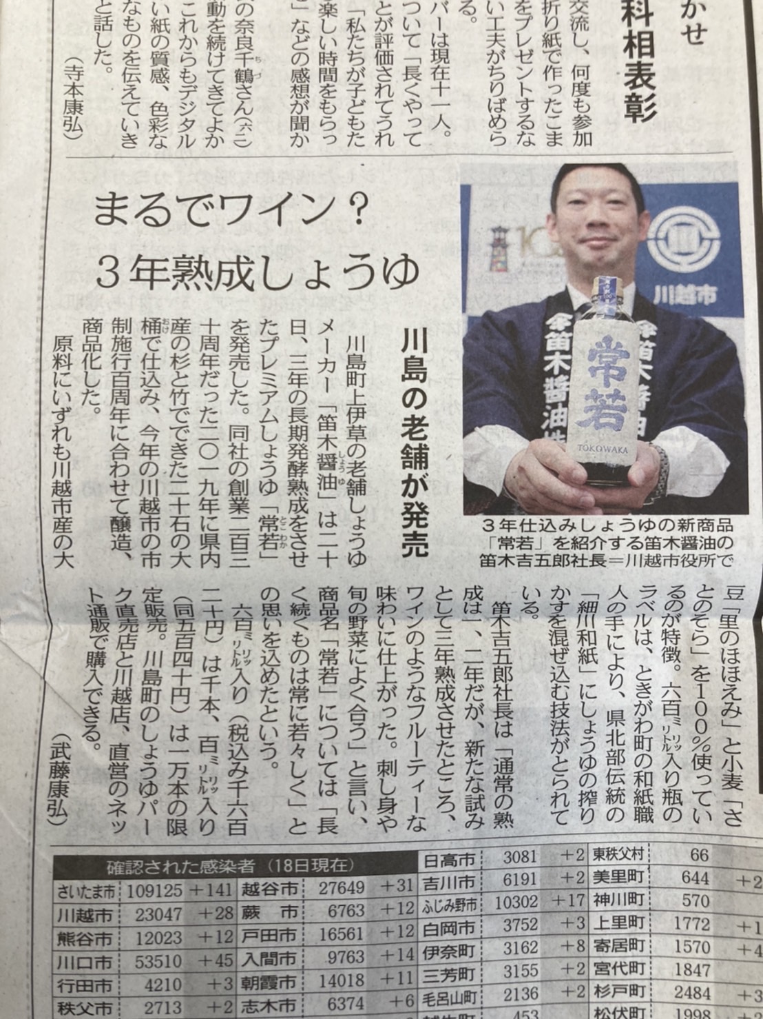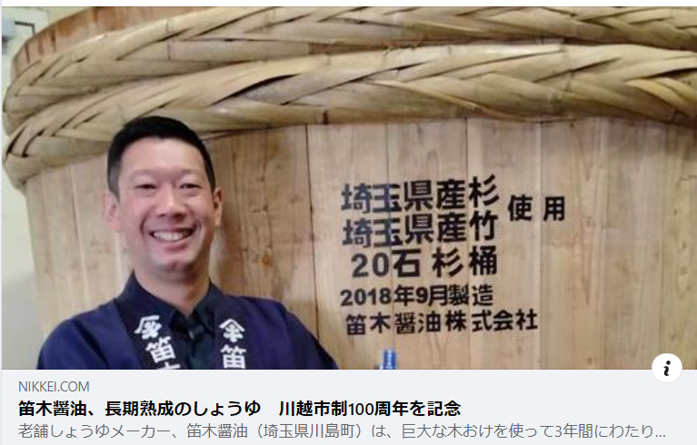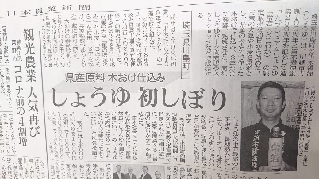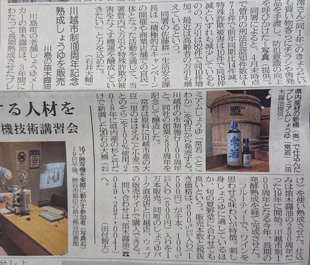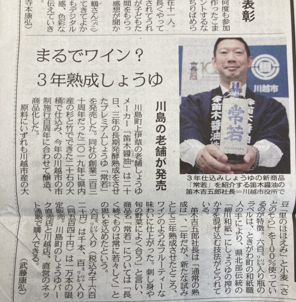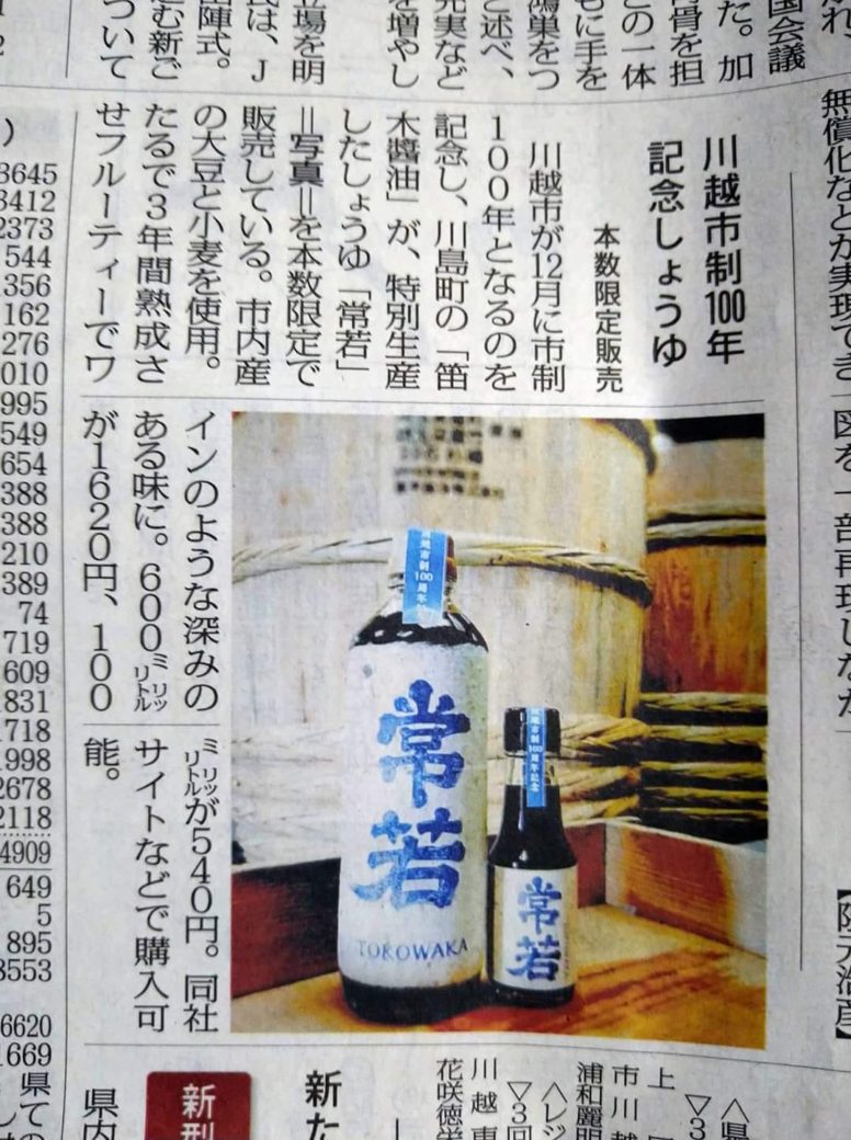 埼玉新聞さんにも紹介して頂きました、オール埼玉県産木材20石新桶・3年間長長期熟成・川越市100周年・創業230周年記念しょうゆ『常若』!