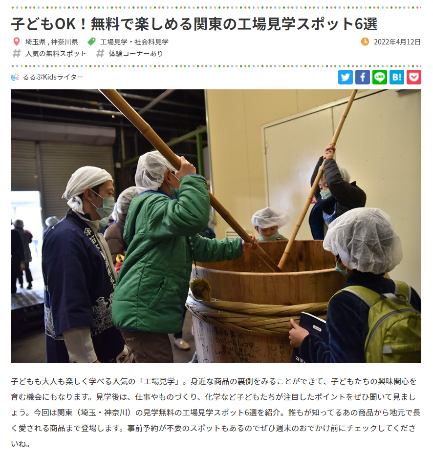 子どもOK!無料で楽しめる関東の工場見学スポット6選 | るるぶKids (rurubu.jp) にてご紹介いただきました!
