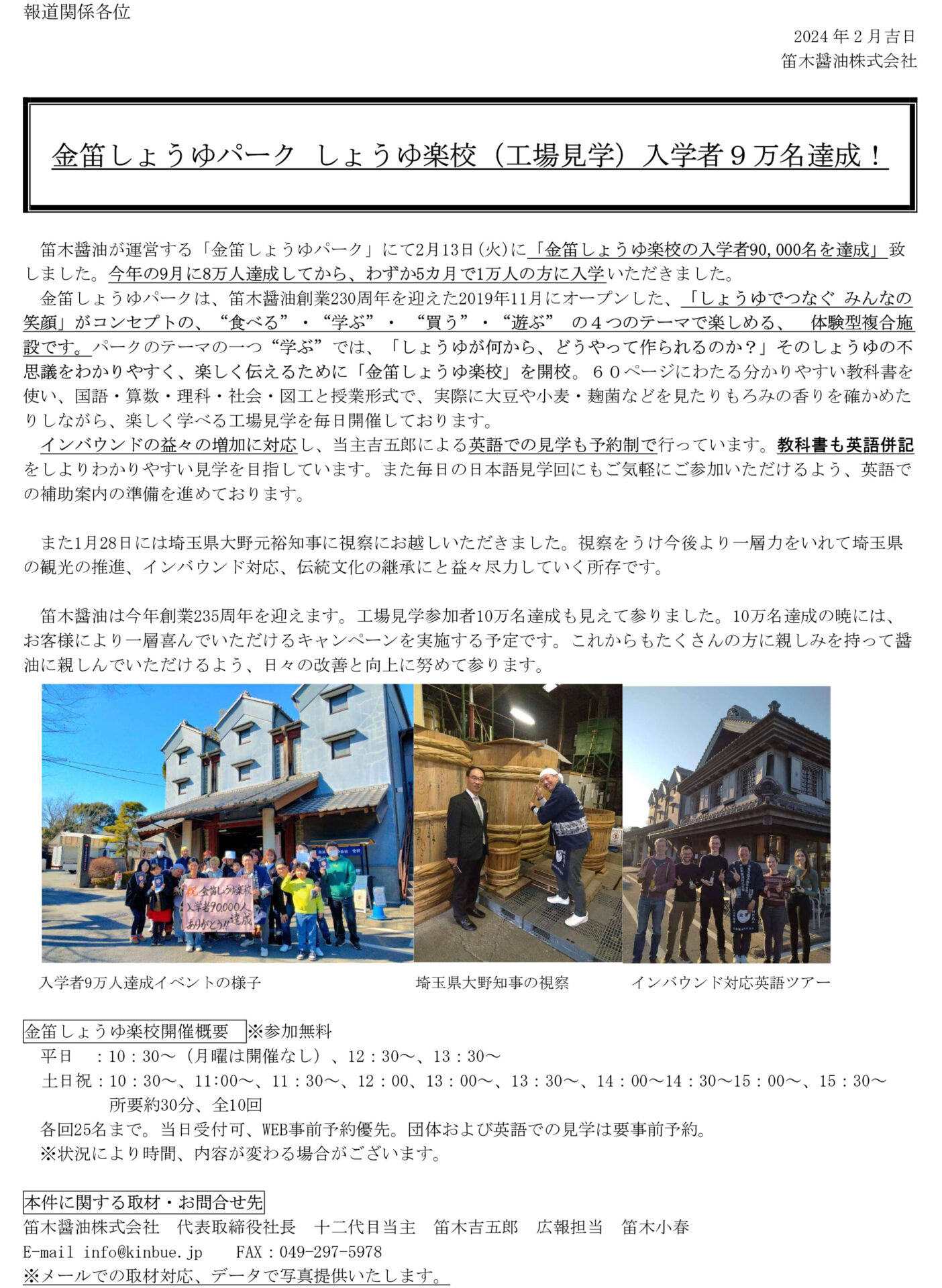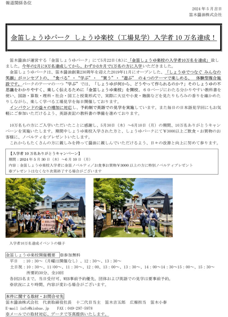 【プレスリリース】金笛しょうゆ楽校入学者10万名達成!