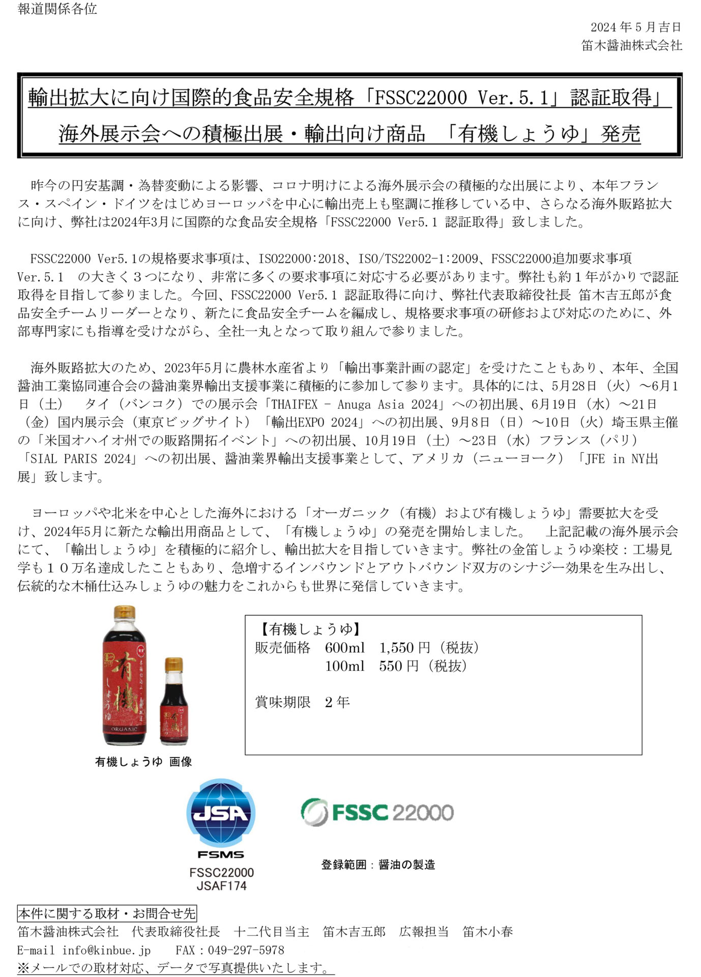 【プレスリリース】国際的食品安全規格「FSSC22000 Ver.5.1」認証取得/「有機しょうゆ」発売