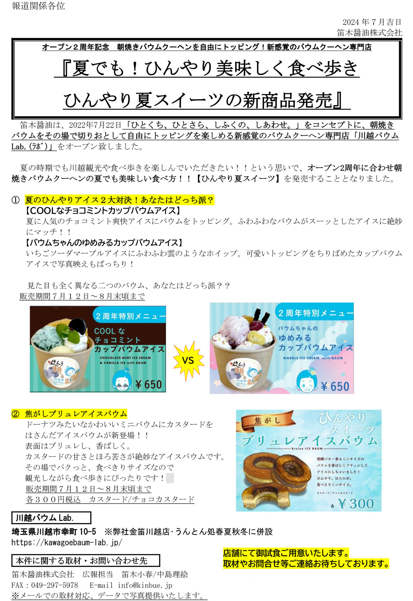【プレスリリース】川越バウムLab.2周年記念『ひんやり夏スイーツの新商品発売』