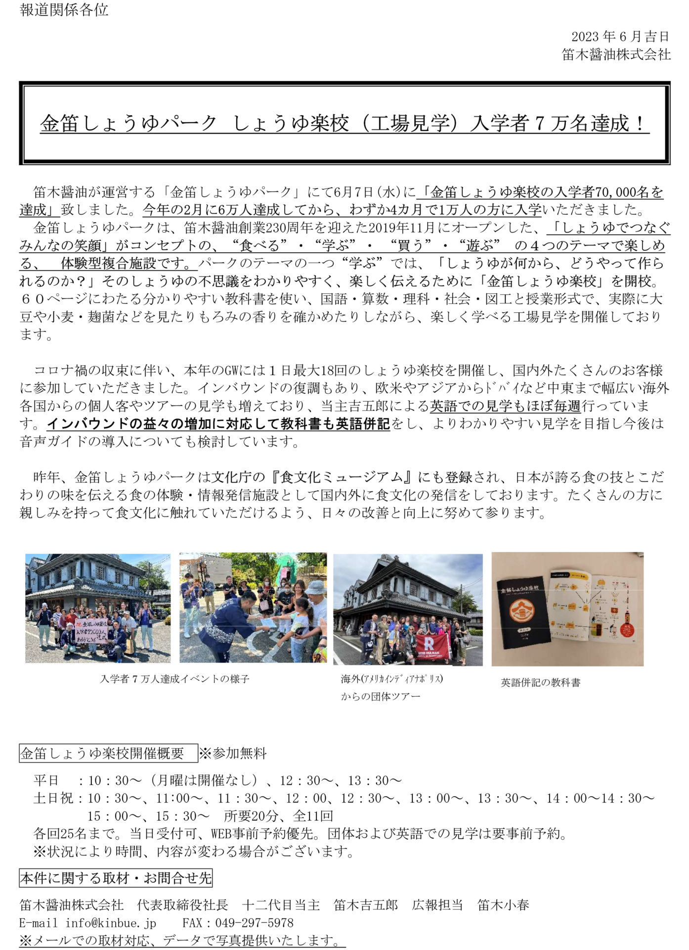 【プレスリリース】金笛しょうゆ楽校入学者70000名達成!