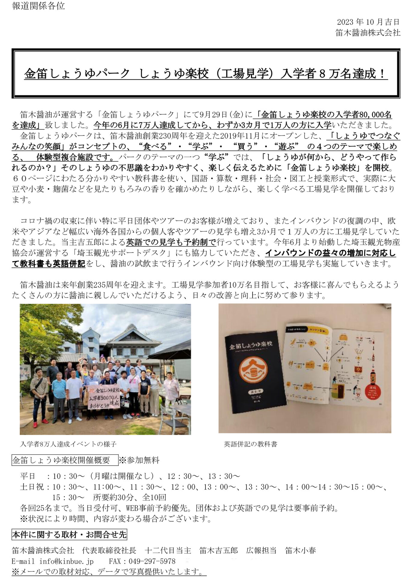 【プレスリリース】金笛しょうゆ楽校入学者8万名達成