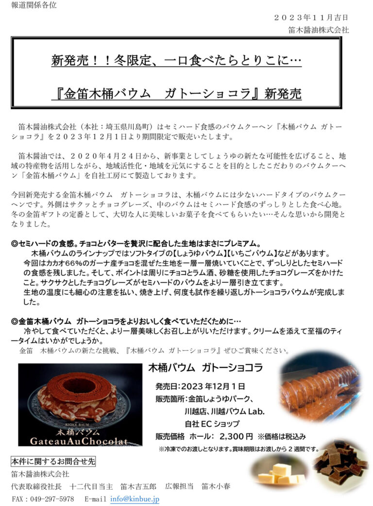 【プレスリリース】金笛木桶バウム 『ガトーショコラ』新発売