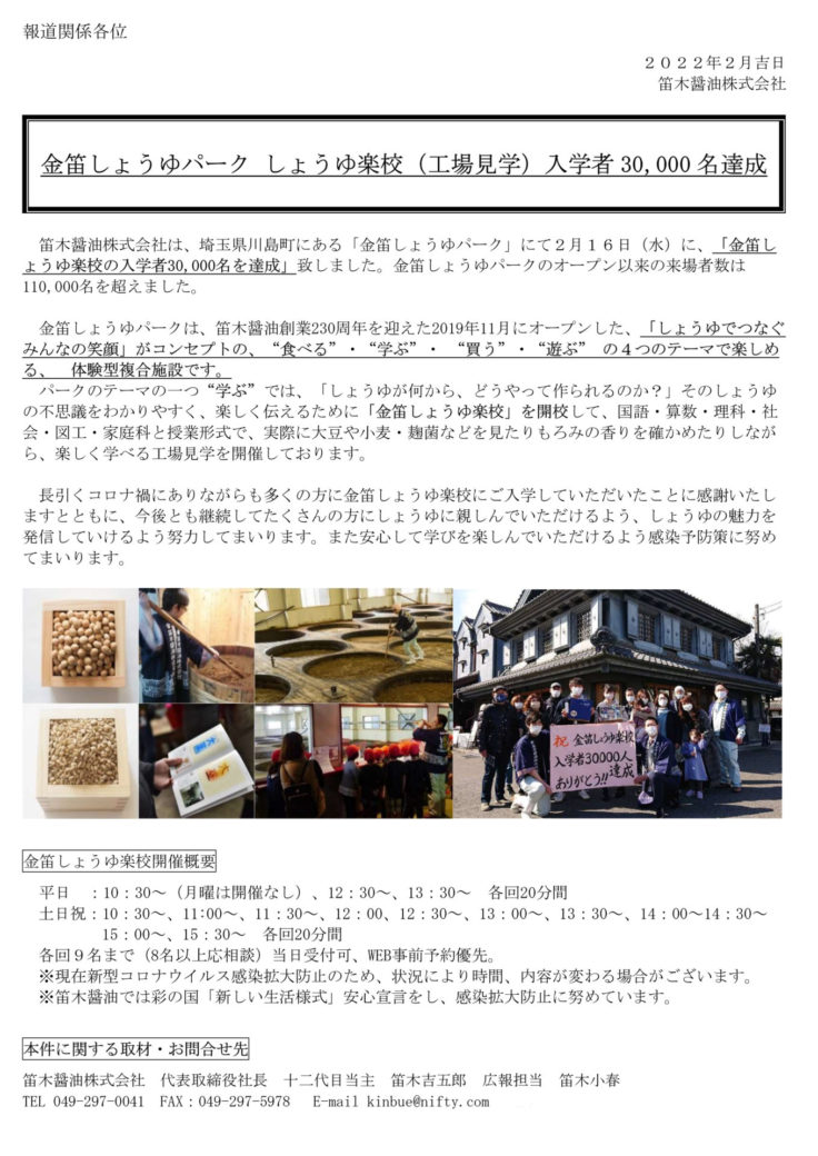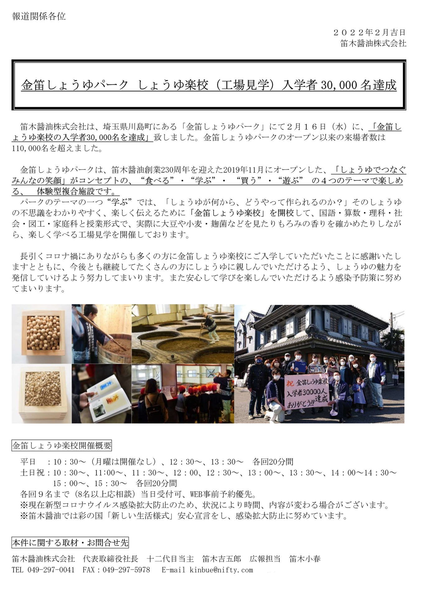 【プレスリリース】金笛しょうゆ楽校入学者30000名達成