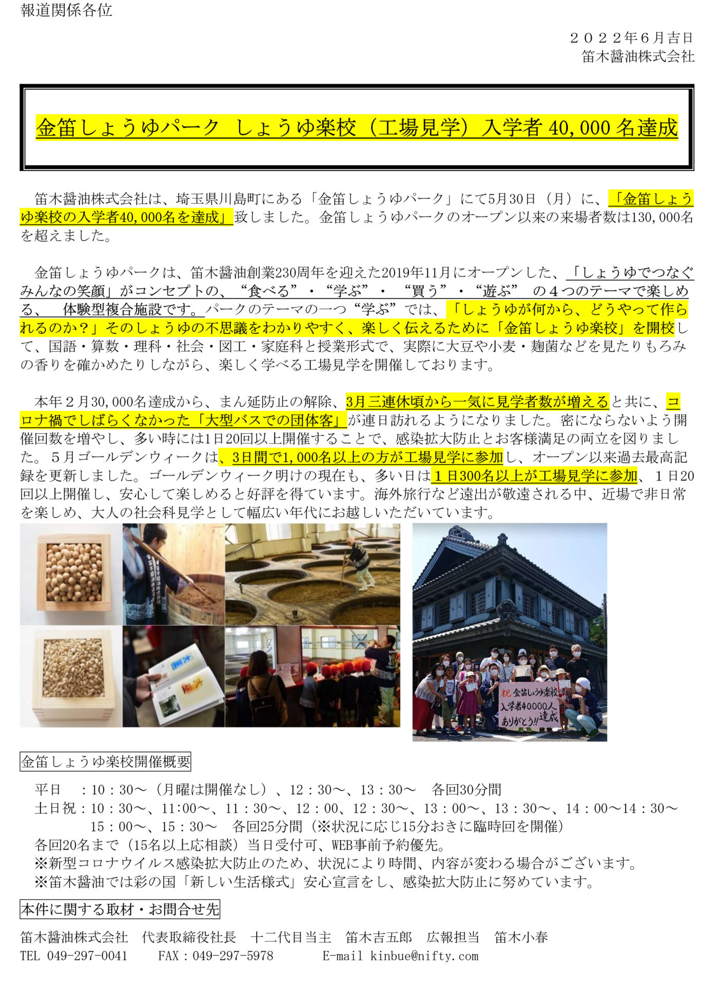 【プレスリリース】金笛しょうゆパーク しょうゆ楽校入学者40,000名達成
