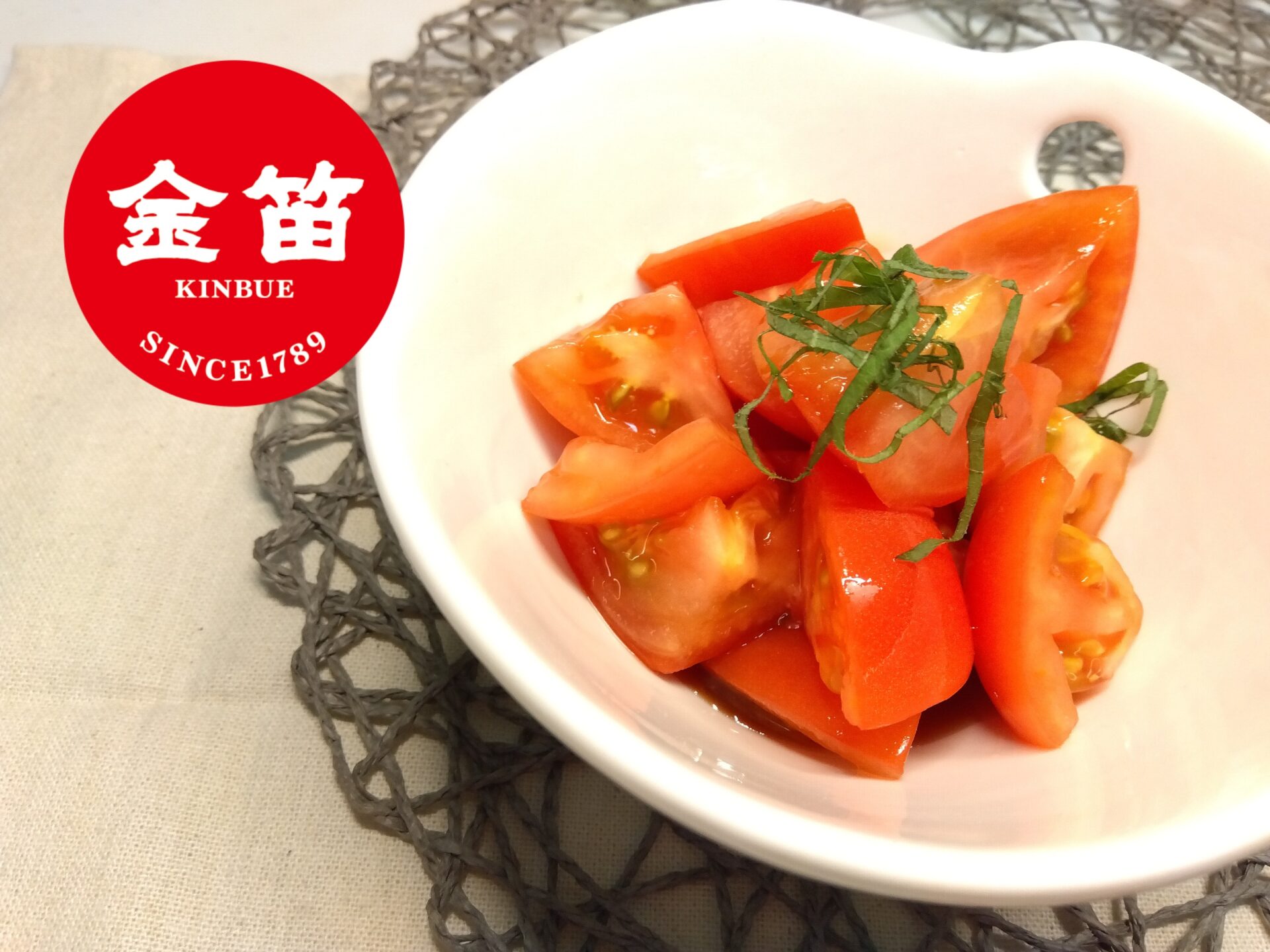 トマトの和風マリネ。材料・トマト2個、春夏秋冬のだしの素大さじ1、リンゴ酢大さじ1、大葉適量。