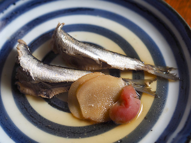 梅干しから種を取り出し、果肉を包丁でペースト状になるまで叩く。ボウルに梅肉、醤油、みりん、酢と入れて混ぜる。